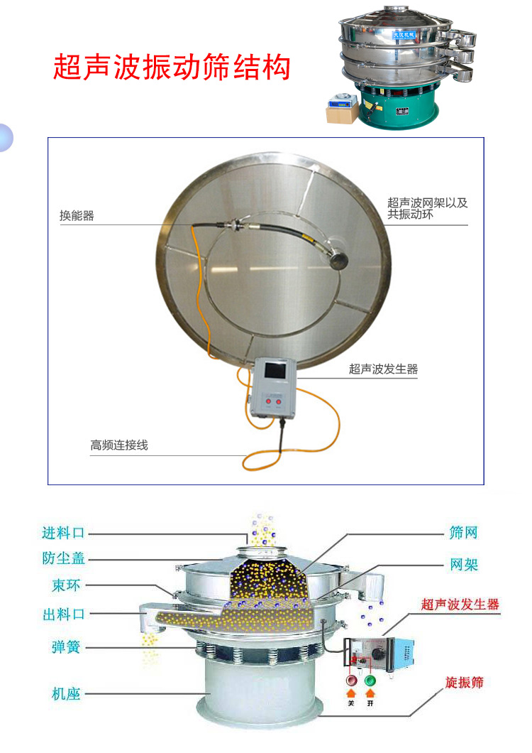 超聲波振動篩是將220v、50HZ或110v、60HZ電能轉(zhuǎn)化為38KHZ的高頻電能,輸入超聲換能器,將其變成38KHZ機(jī)械振動,從而達(dá)到篩分和清網(wǎng)的目的。
