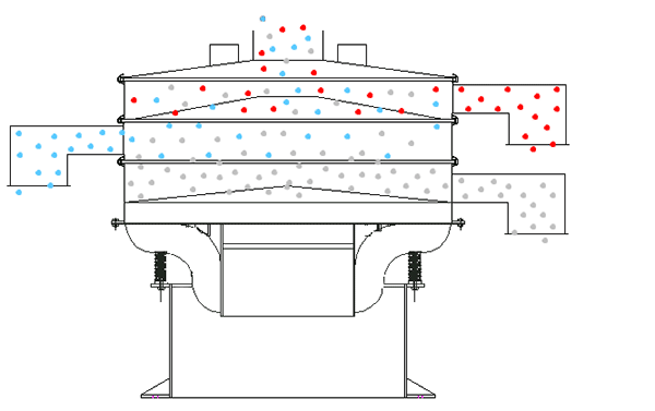 旋振篩是由直立式電機(jī)作激振源,電機(jī)上、下兩端安裝有偏心重錘,將電機(jī)的旋轉(zhuǎn)運動轉(zhuǎn)變?yōu)樗?、垂直、傾斜的三次元運動,再把這個運動傳遞給篩面。調(diào)節(jié)上、下兩端的相位角,可以改變物料在篩面上的運動軌跡。