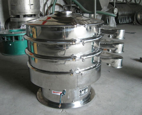 DH-800型全不銹鋼振動(dòng)篩為直徑800mm,單層兩個(gè)出料口,網(wǎng)架為子母網(wǎng)分離式,整機(jī)為不銹鋼材質(zhì),工作原理是由直立式振動(dòng)電機(jī)作為激振源,電機(jī)上、下兩端安裝有偏心重錘,將電機(jī)的旋轉(zhuǎn)運(yùn)動(dòng)轉(zhuǎn)變?yōu)樗?、垂直、傾斜的三次元運(yùn)動(dòng),再把這個(gè)運(yùn)動(dòng)傳遞給篩面。調(diào)節(jié)上、下兩端的相位角,可以改變物料在篩面上的運(yùn)動(dòng)軌跡。