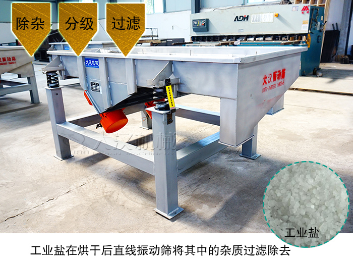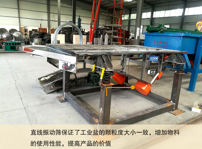 工業(yè)鹽在生產(chǎn)包裝發(fā)貨前可能會混有雜質(zhì),所以需要使用振動篩先將其篩分過濾掉,才能進入下一步的包裝機中,在工業(yè)鹽生產(chǎn)線上通常需要有兩道振動篩來對物料的品質(zhì)進行把控,所以大漢根據(jù)多年篩選經(jīng)驗推薦您使用直線振動篩來篩分工業(yè)鹽。