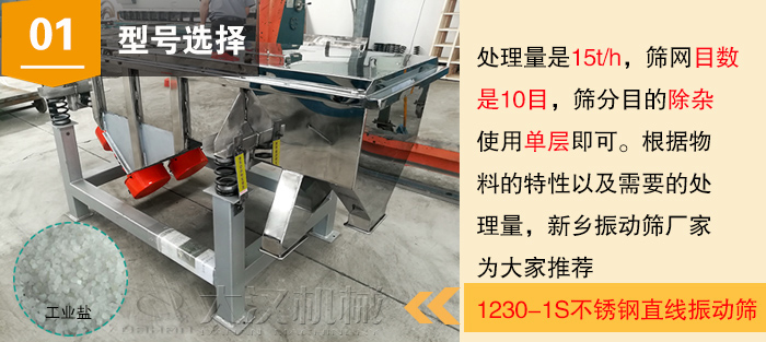 下面小編從型號選擇、方案設(shè)計、篩機材質(zhì)這三個方面給大家介紹一下篩分工業(yè)鹽用直線振動篩好在哪里?希望這個簡單的技術(shù)分享便于各位需要工業(yè)鹽篩分用戶參考: