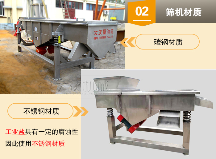 【篩機材質(zhì)】——常用的直線振動篩有不銹鋼和碳鋼兩種材質(zhì),因為工業(yè)鹽具有一定的腐蝕性,因此使用不銹鋼材質(zhì),使用時間更長,對物料也具有保護作用。