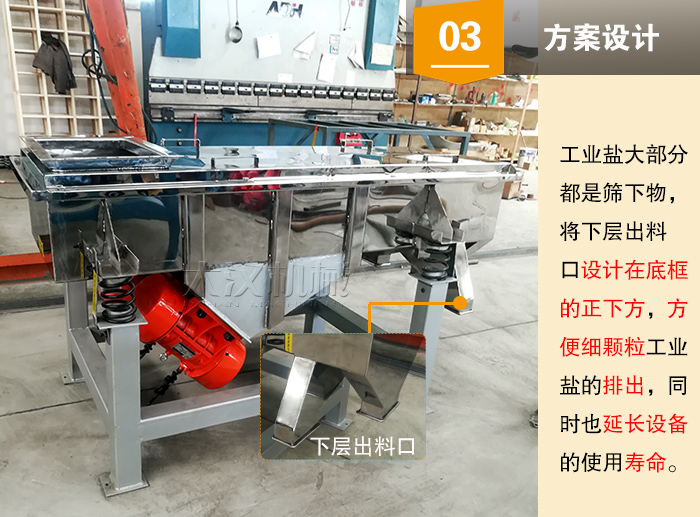 【方案設(shè)計】——工業(yè)鹽大部分都是篩下物,因此要對直線振動篩的下出料口進行改造,將下層出料口設(shè)計在底框的正下方,方便細(xì)顆粒工業(yè)鹽的排出,同時也延長設(shè)備的使用壽命。