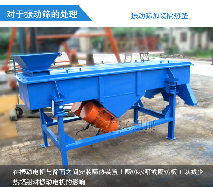 當高溫物料直接進入振動篩篩箱內(nèi),回因為高溫的原因造成振動電機燒壞,從而使振動篩不能進行正常的篩分工作。所以在振動電機與篩面之間安裝隔熱裝置(隔熱水箱或隔熱板)以減少熱幅射對振動電機的影響,保證振動電機在允許的高溫下工作。