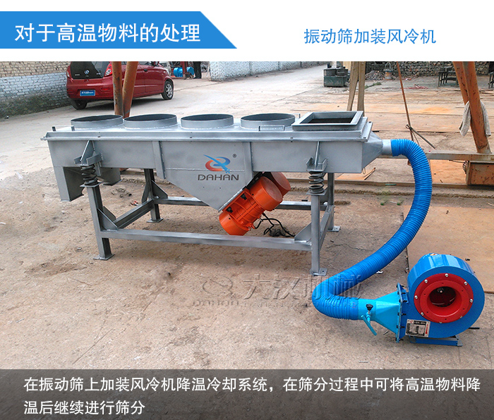 如果加裝隔熱墊還是不能進行高溫物料的篩分,您就必須對高溫物料進行降溫后再行篩分,這樣的物料降溫可以在振動篩上加裝風冷機降溫冷卻系統(tǒng),在篩分過程中可將高溫物料降溫后繼續(xù)進行篩分。