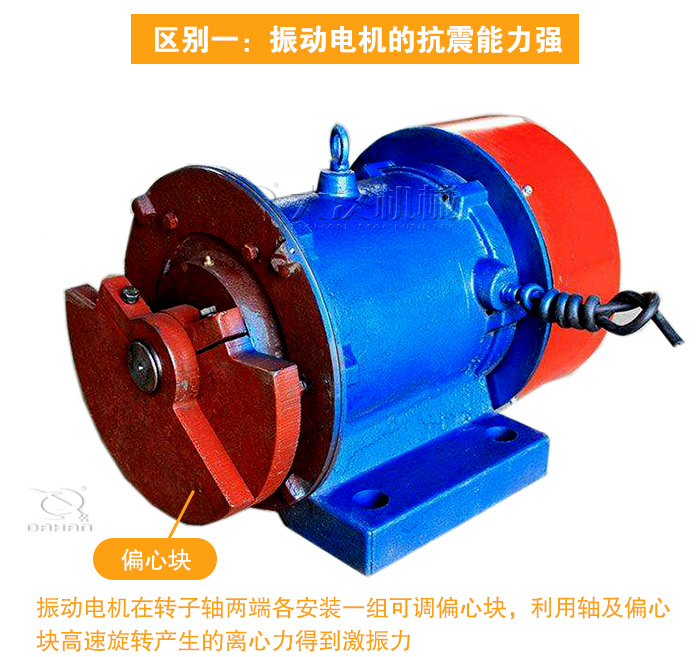 振動(dòng)電機(jī)和普通電機(jī)的內(nèi)部結(jié)構(gòu)相同。主要區(qū)別是振動(dòng)電機(jī)在轉(zhuǎn)子軸兩端各安裝一組可調(diào)偏心塊,利用軸及偏心塊高速旋轉(zhuǎn)產(chǎn)生的離心力得到激振力。振動(dòng)電機(jī)比普通電機(jī)的機(jī)械和電氣方面都要求有可靠的抗震能力。同樣功率等級(jí)的振動(dòng)電機(jī)的轉(zhuǎn)子軸要比同級(jí)別普通電機(jī)的軸粗得多。