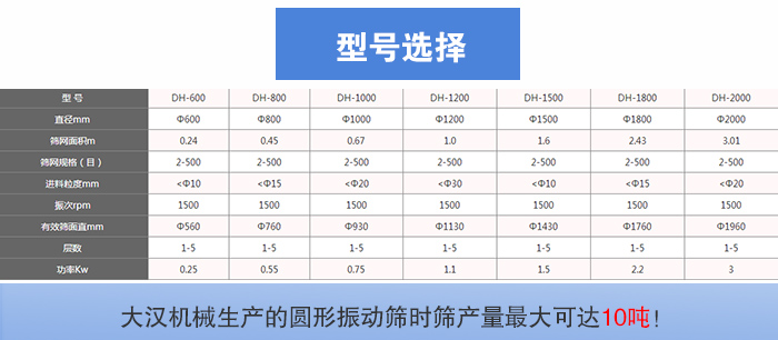 大漢機(jī)械生產(chǎn)的圓形振動(dòng)篩時(shí)篩產(chǎn)量可達(dá)10噸!型號(hào)有:DH-400mm、DH-600mm、DH-800mm、DH-1000mm、DH-1200mm、DH-1500mm、DH-1800mm、DH-2000mm等八種標(biāo)準(zhǔn)型號(hào)。可滿足肥料每小時(shí)500KG—10T的大、中、小產(chǎn)量的篩分工作。