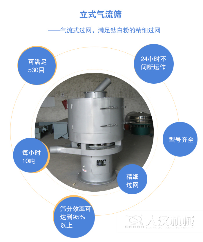 大漢機(jī)械生產(chǎn)的氣流篩分機(jī)可以滿足530目以內(nèi)的超微細(xì)粉篩分,所以對(duì)于400目鈦白粉的篩分工作可以輕松滿足。