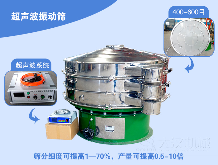 超聲波振動(dòng)篩是在普通的振動(dòng)篩上加裝了超聲波電源系統(tǒng),適用于400目 - 600目超細(xì)物料的篩分、除雜、過濾、分級(jí)。