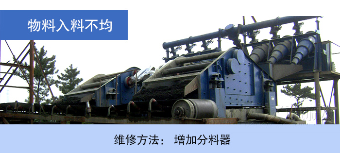 進(jìn)入圓振篩的下料漏斗,是一個(gè)人字型的漏斗,而入料皮帶時(shí)常跑偏和漏斗積泥等原因,導(dǎo)致分料不均,從而致使一邊篩網(wǎng)嚴(yán)重過載,而另一邊篩網(wǎng)近乎空載運(yùn)行,所以常造成篩網(wǎng)磨損不均破損較快。