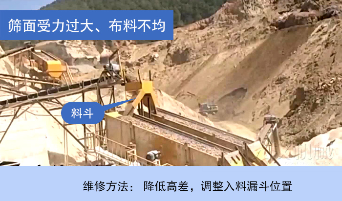 漏斗和圓振篩入料端距離太高,礦石從漏斗進(jìn)入圓振篩時(shí),對(duì)入料處沖擊力過大,導(dǎo)致入料處大梁斷裂、箱體開裂等問題;礦石進(jìn)入圓振篩入料端后,分布不均勻,礦石總是往一側(cè)跑,只有一半的篩網(wǎng)起到篩分作用,導(dǎo)致一邊積礦嚴(yán)重,篩分效率低。