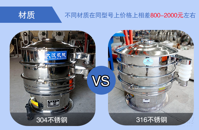 皂粉旋振篩材質(zhì)上可分為304不銹鋼與316不銹鋼,不同材質(zhì)在同型號(hào)上價(jià)格上相差800-2000元左右。皂粉旋振篩在結(jié)構(gòu)材質(zhì)上可分為全不銹鋼材質(zhì)(整機(jī)不銹鋼材質(zhì))和不銹鋼+碳鋼材質(zhì)(與物料部位為不銹鋼材質(zhì),底座為碳鋼材質(zhì))兩種。可根據(jù)不同的篩分使用環(huán)境來選擇不同的結(jié)構(gòu)材質(zhì)。