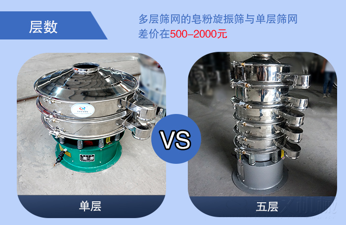 皂粉旋振篩可安裝1-5層篩網(wǎng),同時(shí)進(jìn)行2~6個(gè)等級(jí)的皂粉篩分、過濾、分級(jí)、除雜,可根據(jù)不同的篩分需求安裝不同層數(shù)的篩網(wǎng),安裝多層篩網(wǎng)的皂粉旋振篩肯定會(huì)比單層篩網(wǎng)的要貴一些,他們的差價(jià)在500-2000元左右。具體的層數(shù)選擇就是要根據(jù)您的篩分目的來決定。