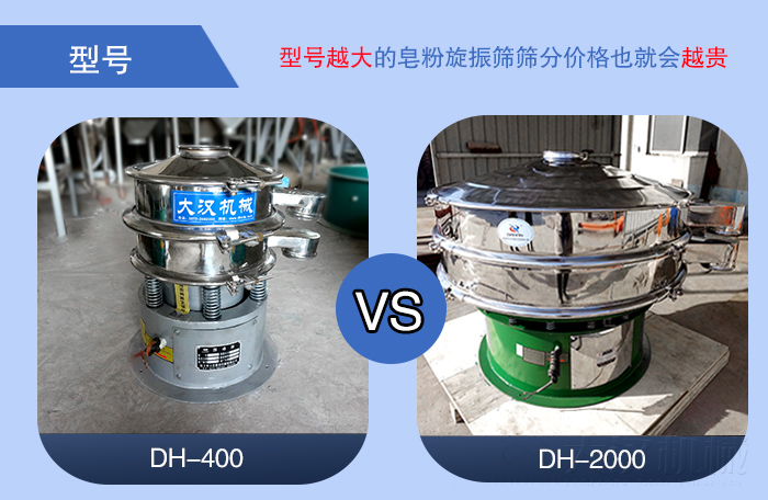 皂粉旋振篩的型號(hào)可分為DH-400、DH-600、DH-800、DH-1000、DH-1200、DH-1500、DH-1800、DH-2000等八種標(biāo)準(zhǔn)型號(hào),型號(hào)差異主要是根據(jù)篩機(jī)直徑?jīng)Q定,直徑越大型號(hào)越大,隨之每小時(shí)篩分的皂粉產(chǎn)量就越大,型號(hào)越大的皂粉旋振篩篩分價(jià)格也就會(huì)越貴。