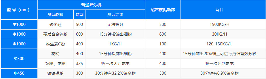 超聲波振動篩的常規(guī)型號有直徑600mm、直徑800mm、直徑1000mm、直徑1200mm、直徑1500mm等。不同種直徑的旋振篩篩分的物料量、目數(shù)也不同。舉個(gè)例子,直徑600型超聲波振動篩測試物料花粉,篩網(wǎng)目數(shù)400目,15分鐘篩出20%的細(xì)粉,并可以進(jìn)行更細(xì)有效分級。