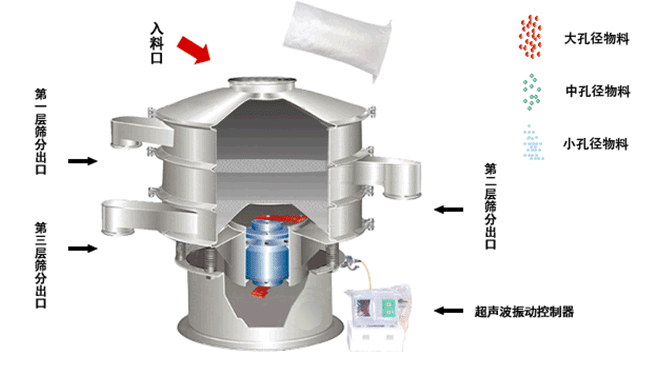 超聲波振動篩是在傳統(tǒng)的普通振動篩基礎(chǔ)上在篩網(wǎng)上加裝了一個超聲波系統(tǒng),超聲波將高頻電能轉(zhuǎn)化轉(zhuǎn)變成超高頻機械振動。物料在篩網(wǎng)上隨機械振動做三次元運動,同時受到超聲波振動波影響,又持續(xù)做高頻率、低振幅運動,篩分的物料接受巨大的超聲加速度,使篩面上的物料始終保持懸浮、騰空狀態(tài),防止它們堵塞網(wǎng)孔,抑制篩分物料在篩分過程中的粘附、摩擦、平降、楔入等現(xiàn)象,真正解決了物料強吸附性、易團聚、易粘黏、高精細、高密度、輕比重等篩分難題,進而達到高效篩分、高產(chǎn)量的目的。