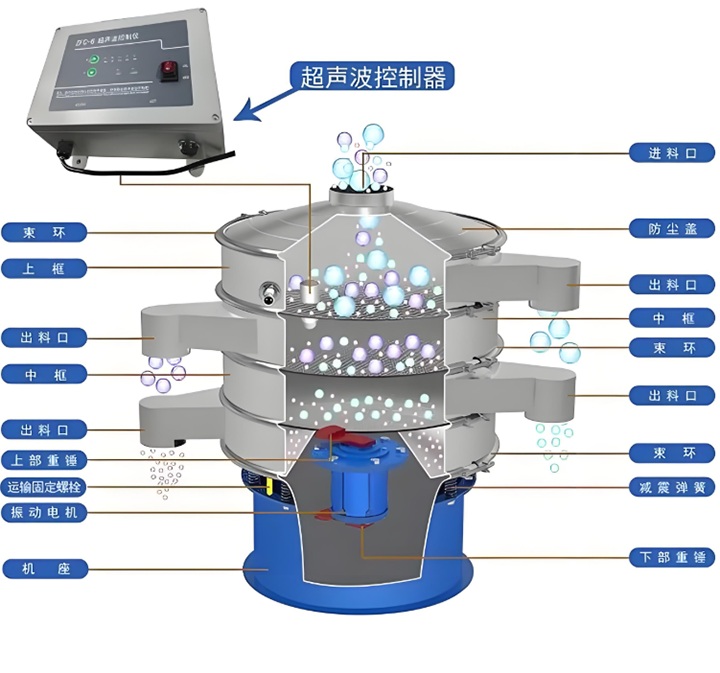 超聲波振動(dòng)篩廠家生產(chǎn)的通用結(jié)構(gòu)是振動(dòng)源、篩箱、篩網(wǎng)、超聲波系統(tǒng)及減震裝置等。振動(dòng)源為物料輸送供能;篩箱是物料篩分核心空間,內(nèi)部裝有200目或500目等不同目數(shù)的篩網(wǎng),篩網(wǎng)通過專用張緊裝置固定以保穩(wěn)定;超聲波系統(tǒng)含超聲波發(fā)生器和換能器,換能器可破物料團(tuán)聚、防堵網(wǎng);減震裝置裝于設(shè)備底部,能吸收設(shè)備運(yùn)行振動(dòng),減少對(duì)地面及周邊設(shè)備影響,同時(shí)保障設(shè)備穩(wěn)定運(yùn)行。我廠的超聲波發(fā)生器分為內(nèi)置式和外置式,并且我廠的超聲波振動(dòng)篩有法蘭式,能夠使物料輸送無(wú)泄漏。