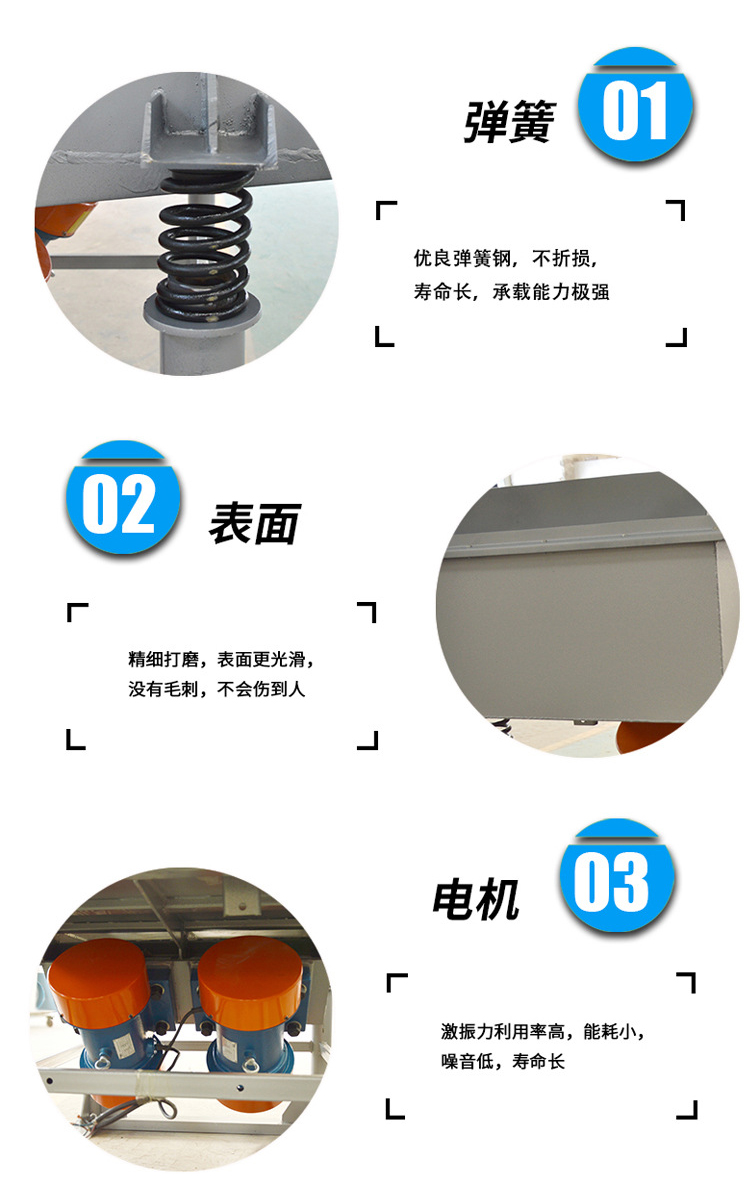 碳鋼直線振動篩主要由篩箱、篩框、篩網(wǎng)、振動電機(jī)、電機(jī)臺座、減振彈簧、支架等組成。
