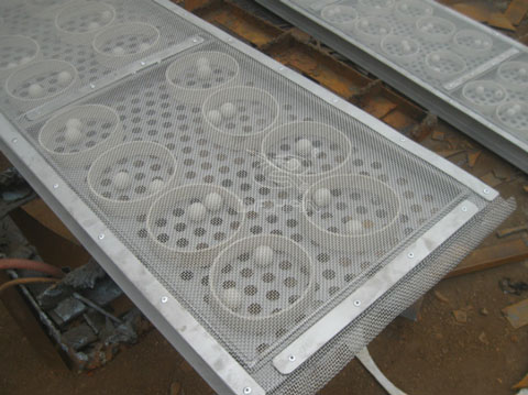 這種網(wǎng)架結(jié)構(gòu)的優(yōu)勢就是更換工作網(wǎng)比較快,工作網(wǎng)下的目網(wǎng)其骨架作用,支撐工作篩網(wǎng),保證篩面的平整度,防止物料沖擊壓塌工作網(wǎng),同時又防止篩板上的彈跳球撞擊工作網(wǎng),把工作網(wǎng)撞破,這種網(wǎng)架結(jié)構(gòu)的缺點就是母網(wǎng)與工作網(wǎng)重疊部分,影響篩分面積。